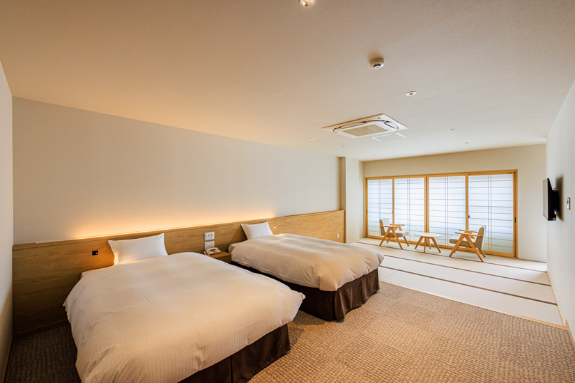 客室は、ベッドを備えたモダン和室、和洋室から伝統的な和室まで多彩に揃えており、どの部屋も上質で心地よい寛ぎ空間として整えられています。
