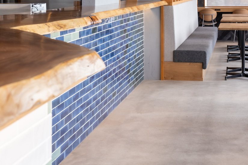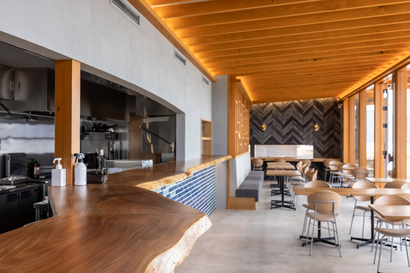 細部へのこだわりも見逃せません。壁のある部分にも、座った目線の高さに小さな窓が設けられており、あらゆる角度から常に景色を楽しめる配慮がされています。ケヤキの一枚板を使ったカウンターには諏訪湖をイメージしたブルーのグラデーションのタイルが施されるなど、建物の中にいながら、自然の中にいるような感覚に包まれる空間演出も魅力。いつもとちがう非日常な時間をリラックスしながら過ごすことができます。
