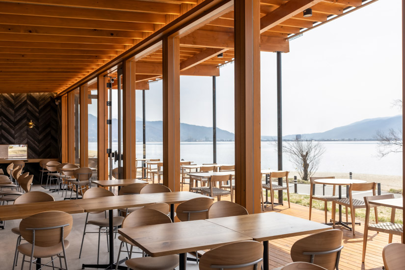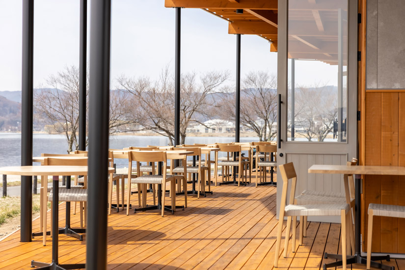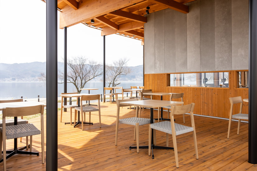 店内に一歩足を踏み入れると、木のぬくもりがあふれる上質でおしゃれな空間が広がります。諏訪湖側はほぼ全面ガラス張りになっており、暖かな陽光が差し込み、外とのつながりを感じる開放感あふれる雰囲気。晴れた日には、テラス席からも店内からも富士山や八ヶ岳の眺めが楽しめます。