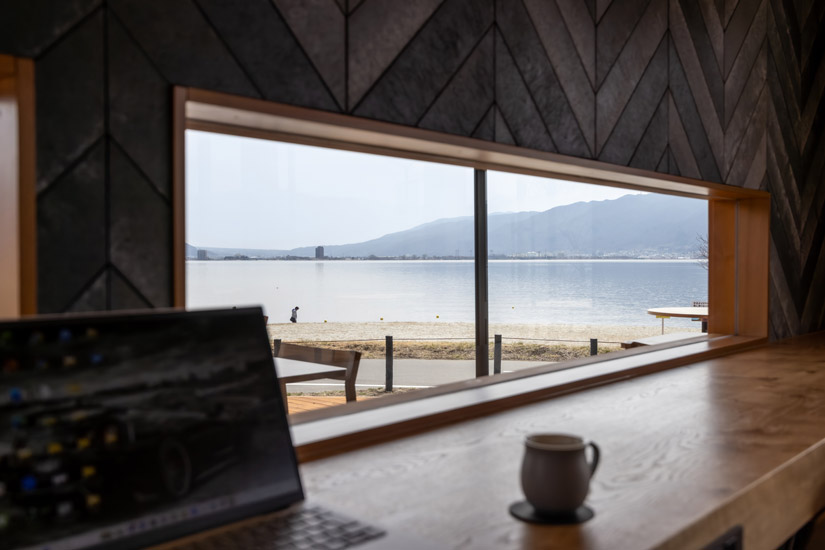 ●自然と溶け合うデザインの建物。諏訪湖の景色を五感で楽しめる最高の場所
