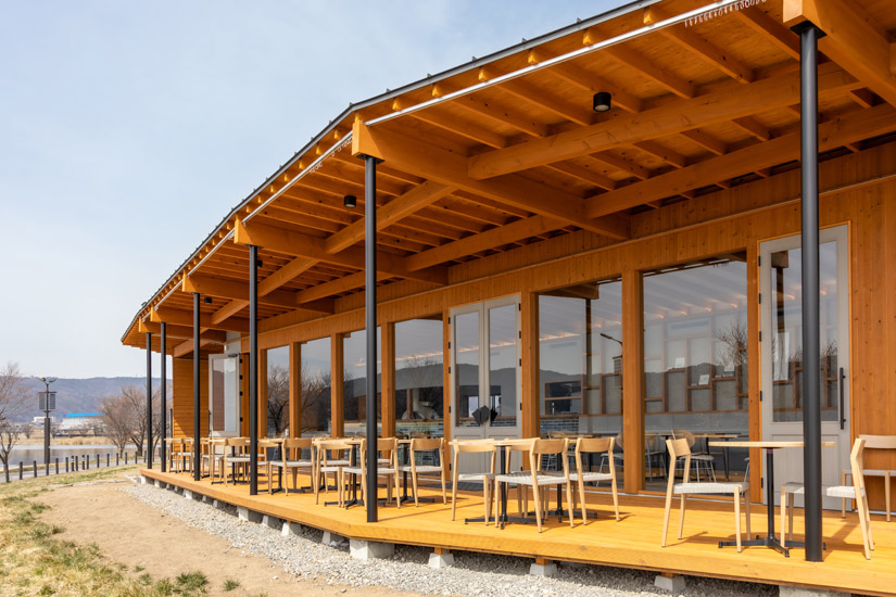 「Suwa no Wa」の建物は、自然に溶け込む曲線を活かしたシンプルなデザインが印象的です。木材をふんだんに取り入れたおしゃれな外観は、周囲の自然の中にすっと馴染み、公園の景観と一体となった美しさを持っています。駐車場から建物に近づくにつれて高揚感が高まる、そんな演出が施されています。