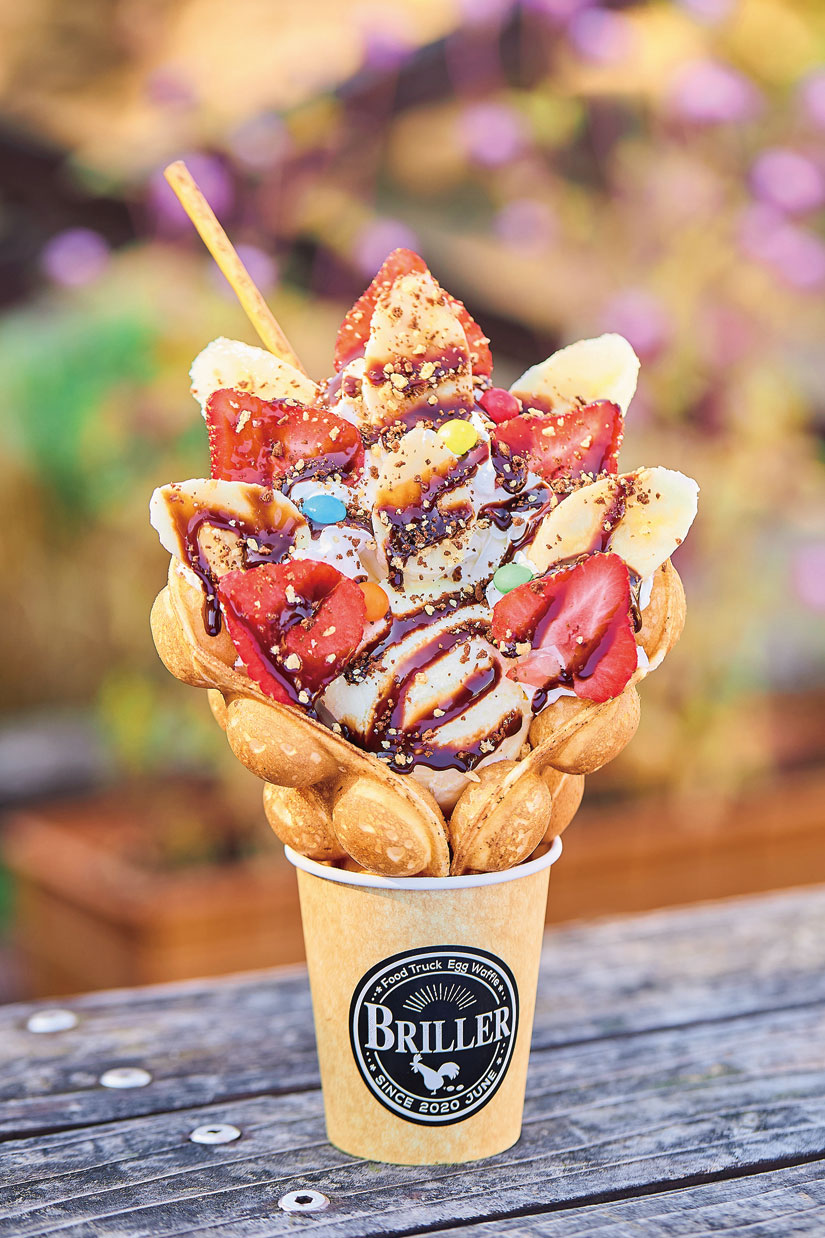 米粉とタピオカ粉、北軽井沢産の牛乳を使ったワッフルです。焼きたての生地は外はサクサク、中はもちもちの食感。アイスや生クリーム、フルーツを重ね、見た目も華やかでSNS映えも抜群の一品。