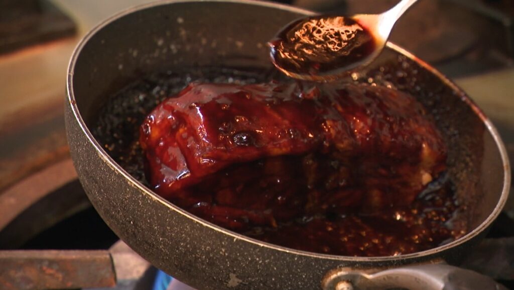 角煮は仕込みに2日かかります。仕上げにかけられるのは30種類以上の食材を使った醤油ベースの特製ソース。瀬川さんはフレンチやイタリアンの経験もあり、その技法をいかして作っています。