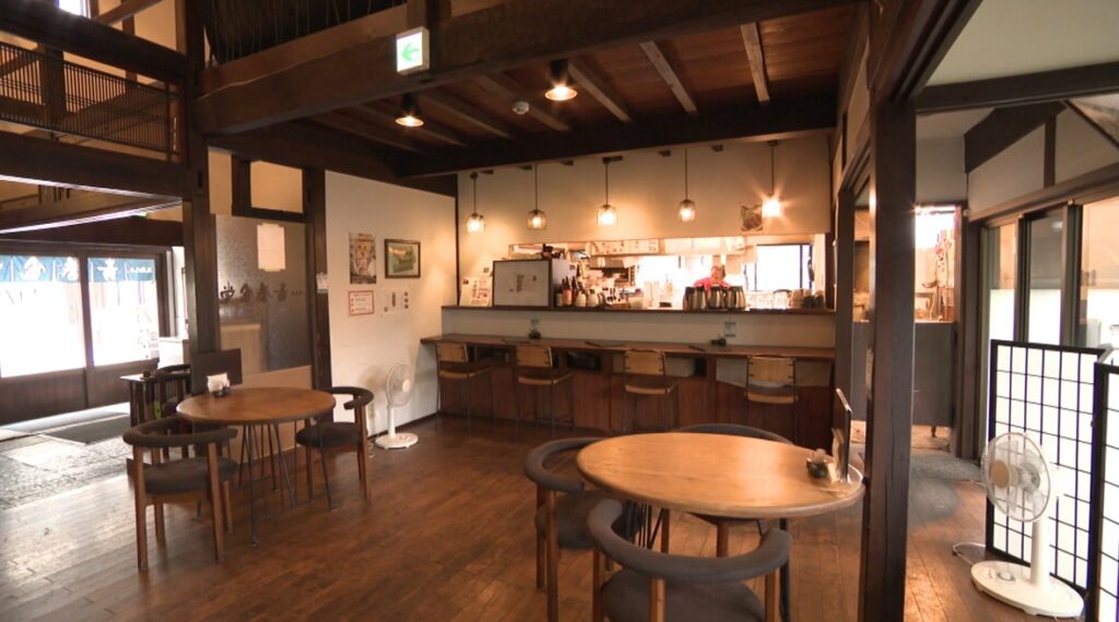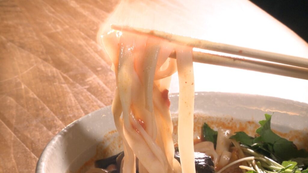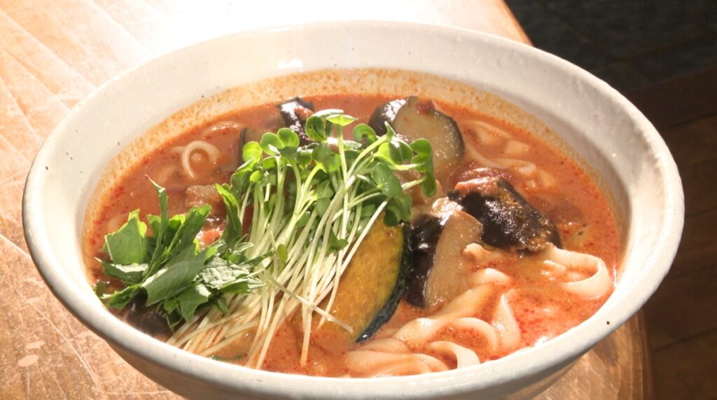 築100年を超える古民家をリノベーションした『三月九日青春食堂』。人気メニューの一つが「トマトカレーうどん」です。トマトとタイのレッドカレーがベースになっていて、麺は地元の製麺所で特別に作ってもらっている米粉麺です。鶏モモ肉に、ナス、カボチャ、きのこなど具材もたっぷり入っています!