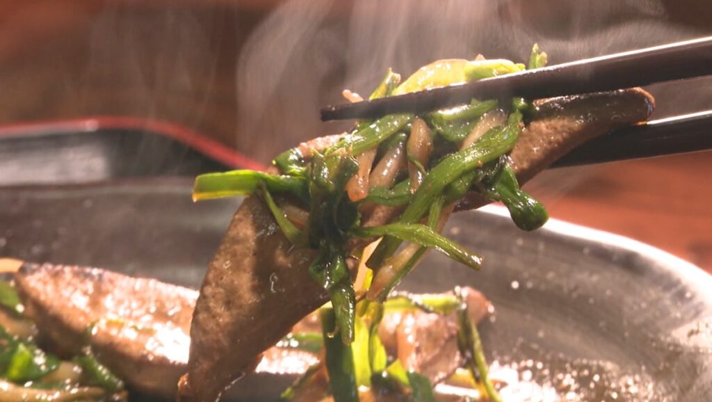 レバニラ炒めは、洋食店で修業した小林さん特製のタレが味の決め手。しょう油の他に、白ワインを使っていて、レバー特有のクセを和らげ、ワンランク上の味わいに仕上げています。まろやかな味わいのレバーに、シャキシャキのもやしとニラ。ご飯が進むのも納得です。