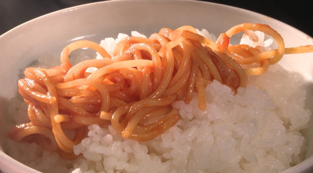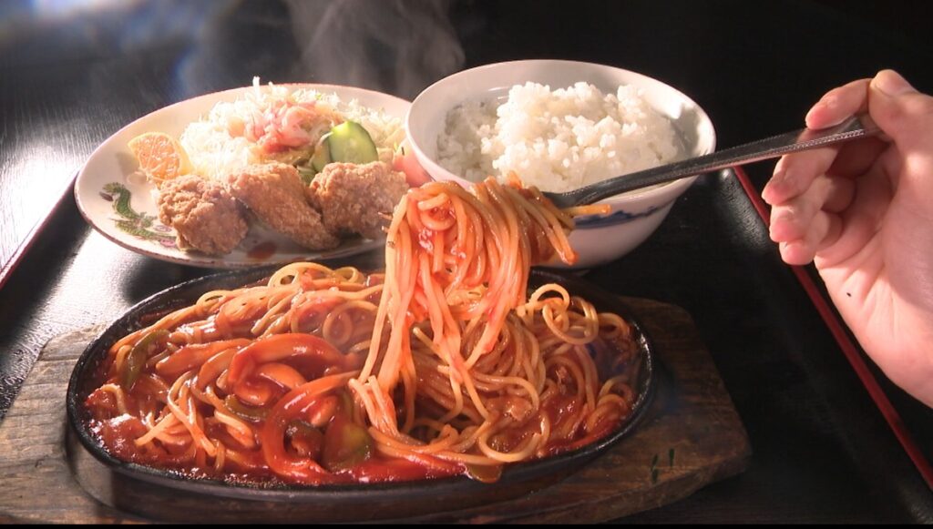 ラーメン用のスープにケチャップ、具材を入れて火にかけ、ゆでたての麺を投入。鉄板に移して、ジュージューと音を響かせて提供されます。ナポリタンはケチャップのコクが効いた昔ながらの味わい。ご飯はナポリタンをバウンドさせて食べたくなります。具材も多いので、「ナポリタンはおかず」という説明にも納得です。