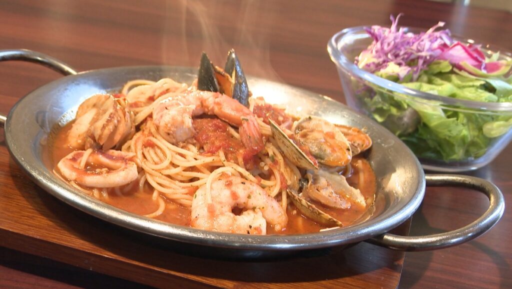 もう一つ、おすすめのあったかメニューがあります。バジルの香りが広がる「元祖海鮮トマトソースパスタ」です。