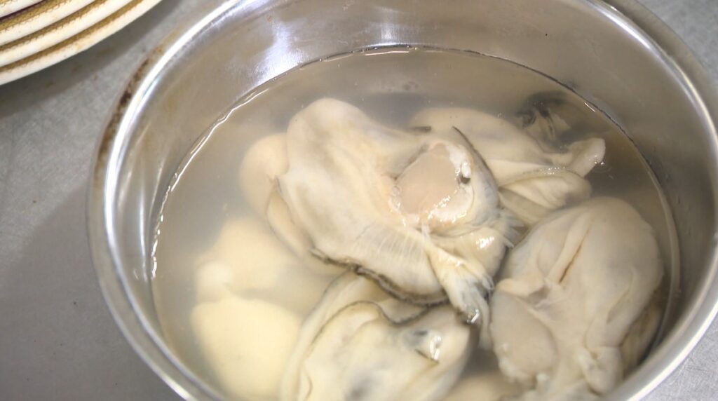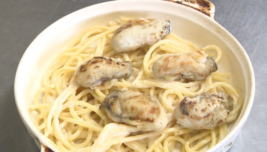 使用するのは「大吟醸」という規格の広島県産生ガキ。それを軽くソテーして、パスタの上に5個のせます。キノコやホウレンソウ、たっぷりのホワイトソースを入れて、オープンで焼き色をつければ完成です。