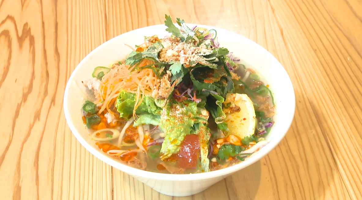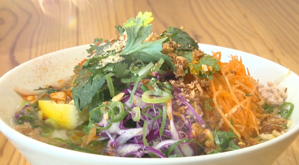 看板メニューのフォーは、鶏ガラや野菜からとる出汁に、スパイスを含めると10種類以上から作るスープに米粉麺を合わせます。レタスや紫キャベツ、パクチーなどの野菜、ナッツをのせて、見た目も鮮やか。