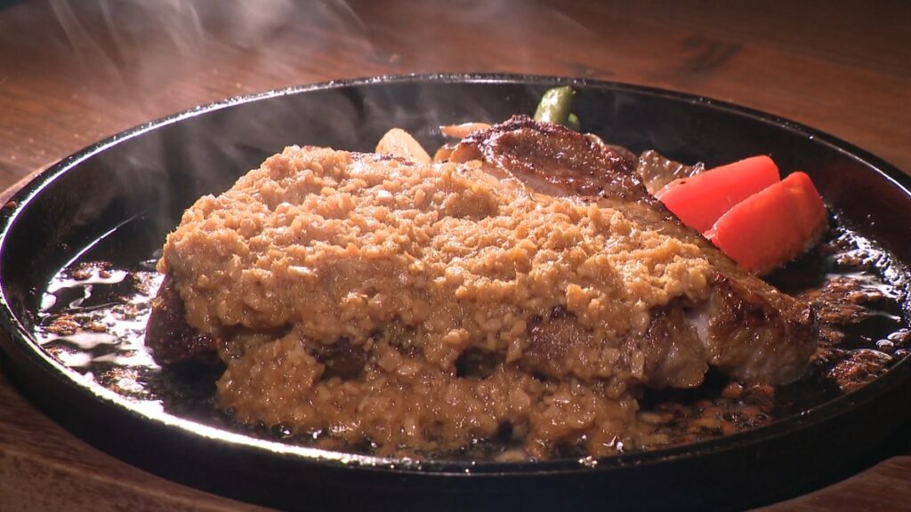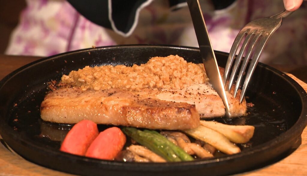 ジュージューと音を立てながら運ばれ来たのは、看板メニューのポークステーキ。220gとボリューム満点です。