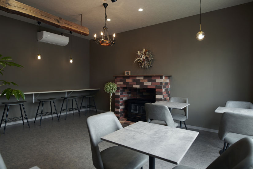店内はグレーを基調にしたスタイリッシュな空間。冬には暖炉が灯り、あたたかい雰囲気の中で心までほっこりできます。