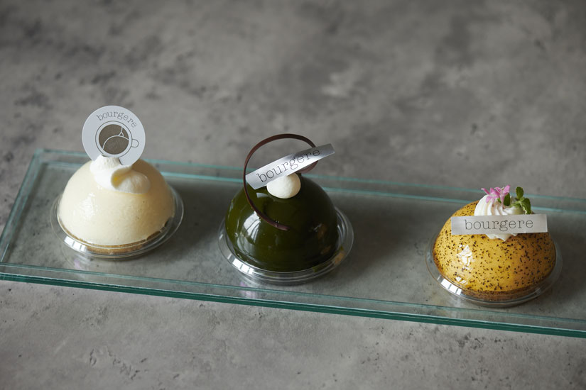 半球型のフォルムが愛らしいムースケーキは、パーツをひとつずつ組み合わせて丁寧に作られ、見た目にも楽しませてくれる逸品。おすすめはマンゴーのガナッシュとライチムースを重ねた「フルール」。
