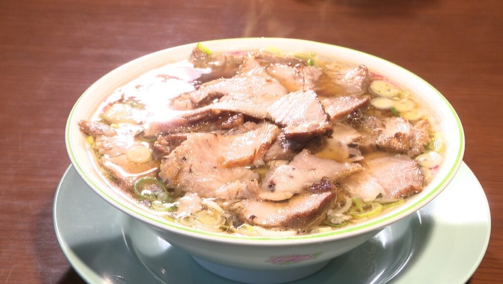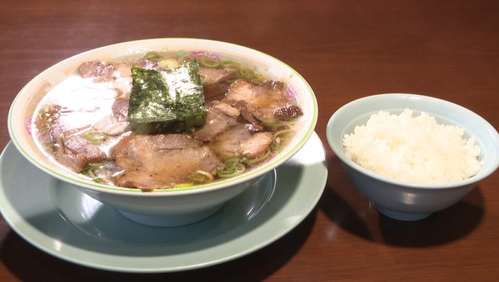 テーブルに運ばれてきたのは看板メニューの「中華そば」。麺が見えないほど、チャーシューが乗っていて、ビジュアルはまさに「チャーシュー麺」です。しかもご飯一杯無料。