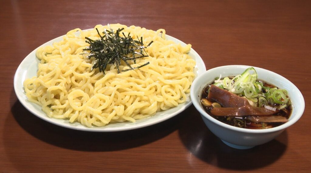 「つけそば」も人気メニューです。麺は2玉分使っています。つけ汁は醤油ベースにサバ節などを加え、甘辛く味付けしてあります。