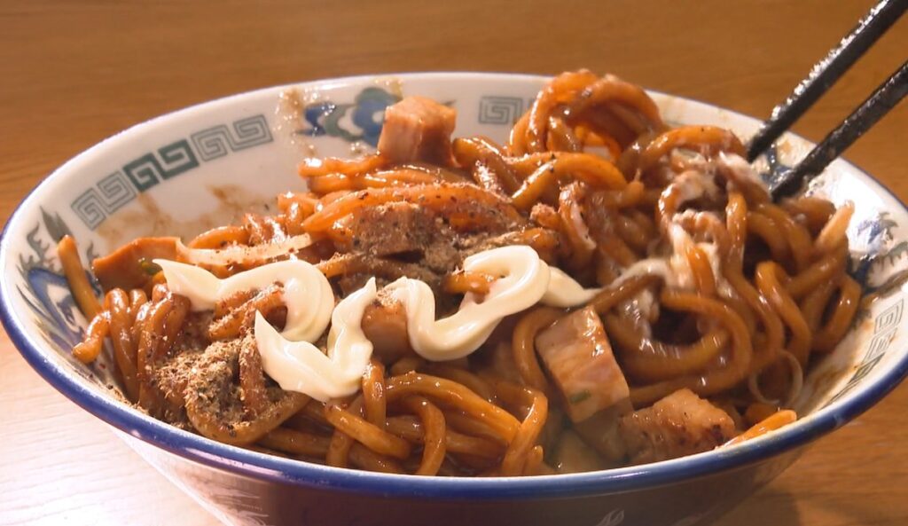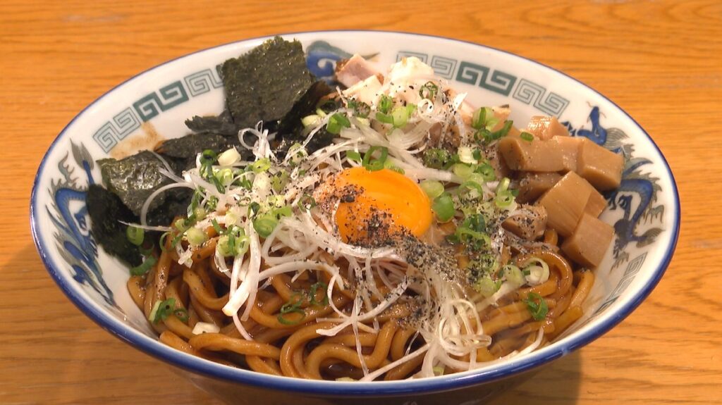 たっぷり汗をかいたら、施設内にある『町民食堂 柿君くん」へ。サウナ飯ともいえるメニューがあります。その名も「御大 油そば」。麺の量はなんと300グラム!秋田県の有名ラーメン店が監修した特製の醤油ダレに絡めていただきます。麺の上にはネギ、チャーシュー、メンマがのって、卵黄と一緒によくかき混ぜます。
