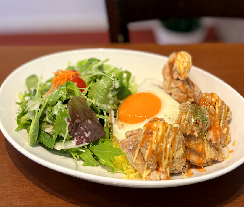 ライスボール(ご飯プレート)には、兵庫県・丹波のベビーリーフのサラダがたっぷり添えられ、ふっくら炊き上げるサフランライスとともにハンバーグやフライドチキンなどを味わうことができます。