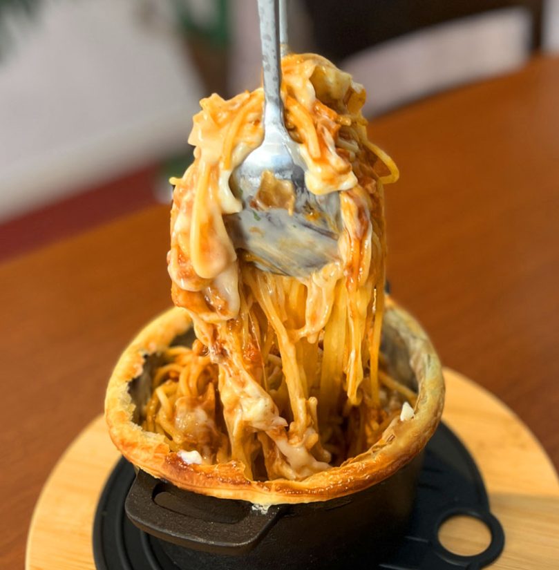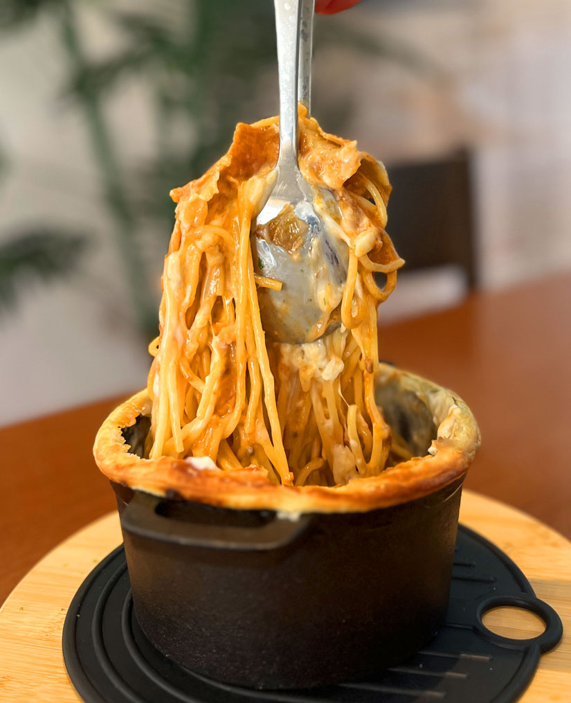 北海道産生クリームを使用して作られるホワイトソースと、完熟トマトペーストと牛肉や玉ねぎでじっくり火を入れた特製ミートソースを合わせ、さらにモッツアレラチーズを加えて、鉄鍋で熱々に仕上げた窯焼きパスタ。
