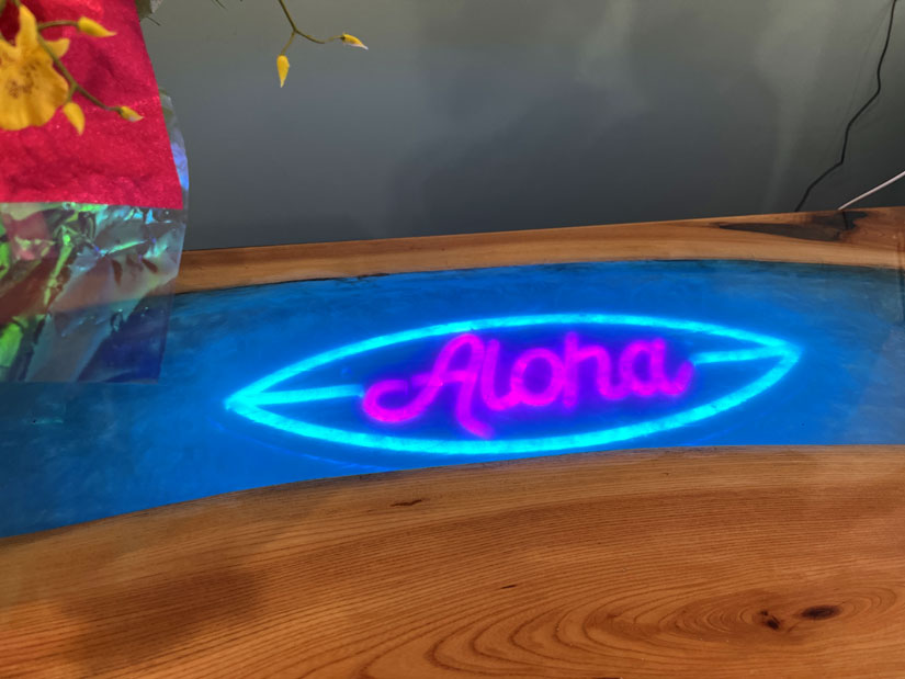 画像左は、長野店オーナーが作ったというネオン管を組み込んだレジカウンター。