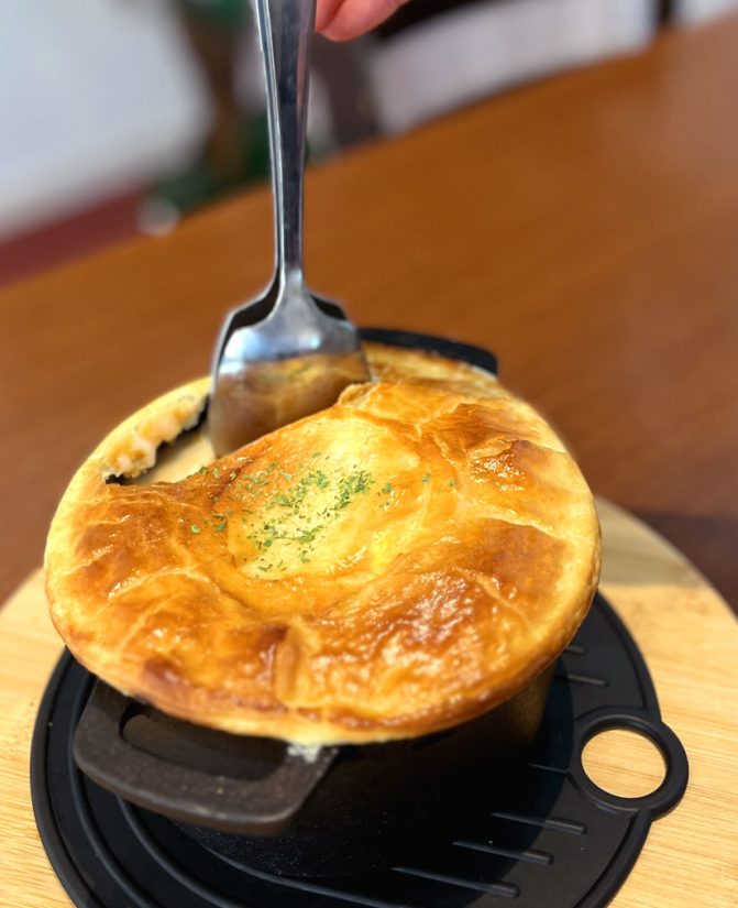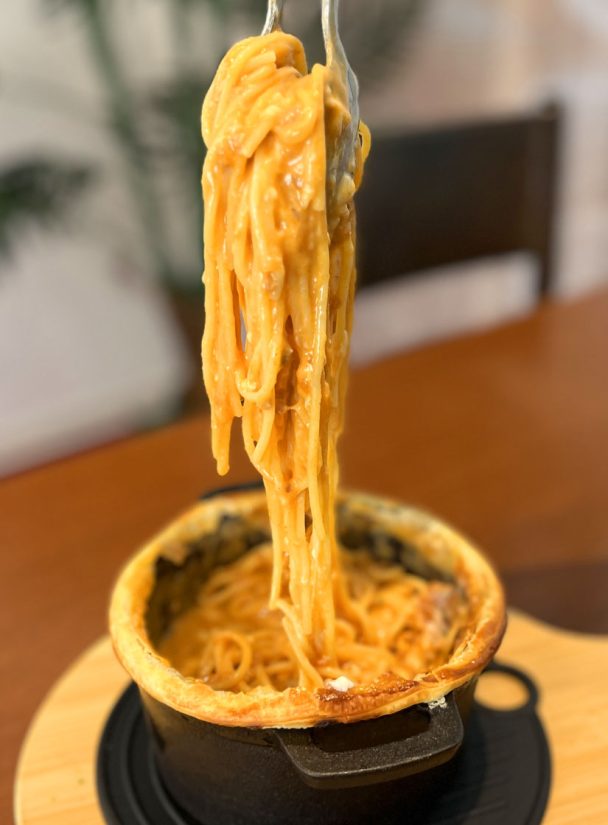 ホワイトソースと牛肉感もしっかり感じられる特製ミートソースというマストな美味しさの組み合わせに、チーズが加わった濃厚なパスタ料理。テーブルで、こんがり焼けたチーズを割り、パスタとまぜていただきます。