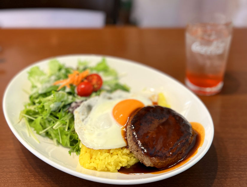 お店のおすすめで、サフランライスとたっぷりのベビーリーフのサラダを添えたハワイのローカルフード「ロコモコ」。ハンバーグに使用するお肉は牛肉のみ。冷凍技術を駆使して岡山県の工場で作られるパティを、店の厨房で生のパティから焼き上げます。特製デミグラスソースを合わせた肉肉しい手ごねハンバーグと目玉焼きとご飯の最強タッグを楽しめますよ。