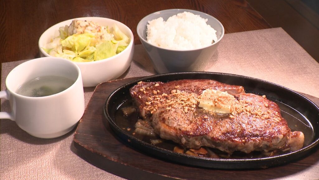 まず登場したのは食欲そそる香りと見た目のステーキ。自家製の醤油ベースのソースで仕上げています。一口頬張ると肉のうま味にバターとソースが絡み、絶妙な味わいを生み出しています。