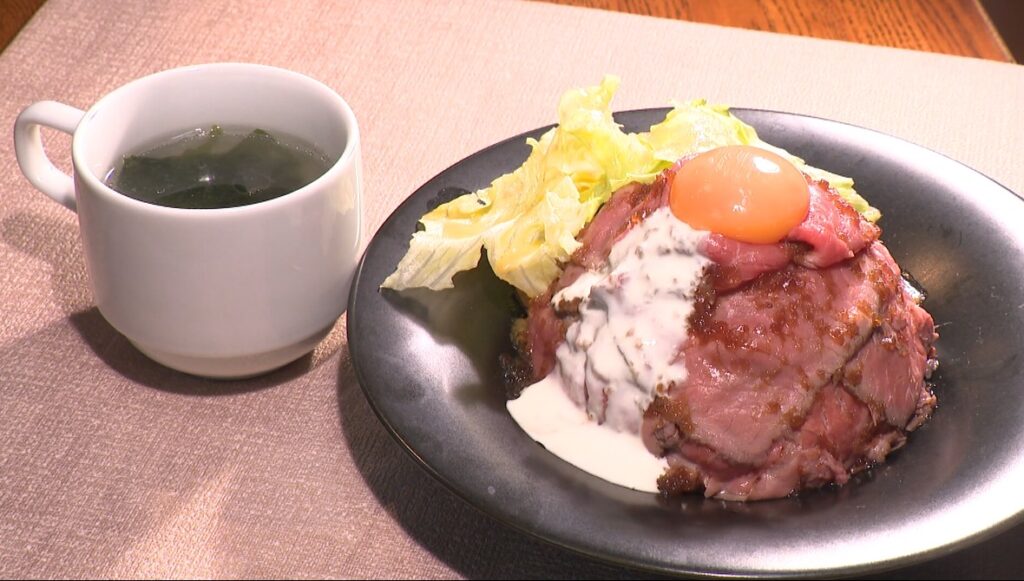 女性に支持されているのがローストビーフ丼。特別な調味液で低温調理していて、「うるおい」がある肉に仕上げているそうです。その薄切りを味付けしたご飯に重ねます。その数、約10枚。しょうゆベースとヨーグルトベースの2種類のソースをかけ、そこに卵黄をオン!