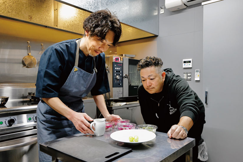 料理を手掛ける小林シェフ。一つひとつ丁寧に盛り付けられていく料理の数々は、何層にも色の層が重なる繊細な一皿に。