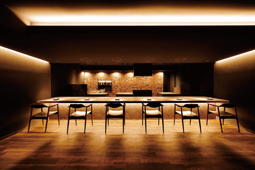 右)レンガタイルが壁一面に広がる、クラシカルな内装。6席限定のカウンター席なので落ち着いた雰囲気の中ゆっくりと食事を楽しめます