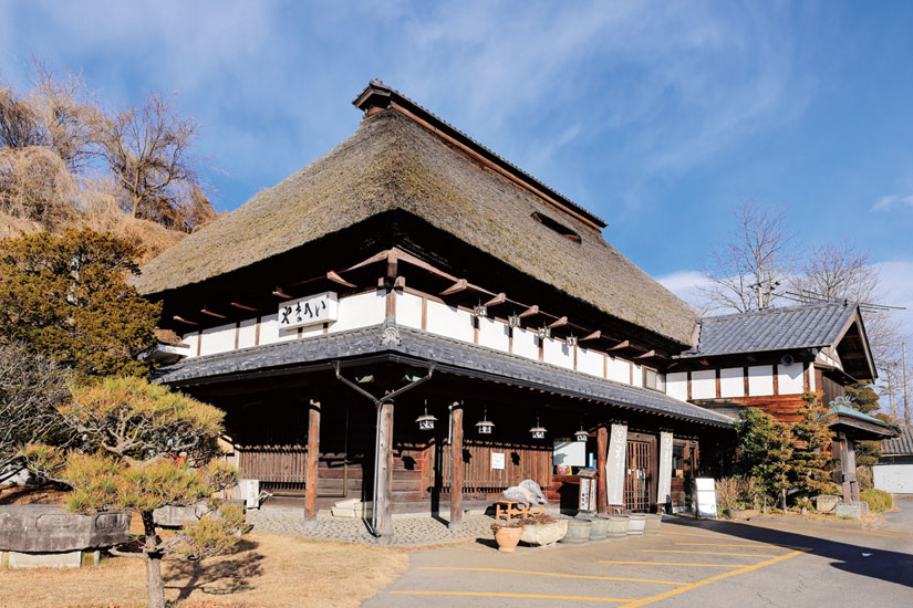 国道18号沿いのかやぶき屋根と水車小屋が目を引く「お食事処 やまへい 小諸店」。