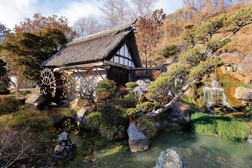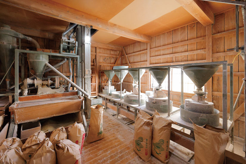 敷地内の水車小屋では石臼を使って自家製粉しています。