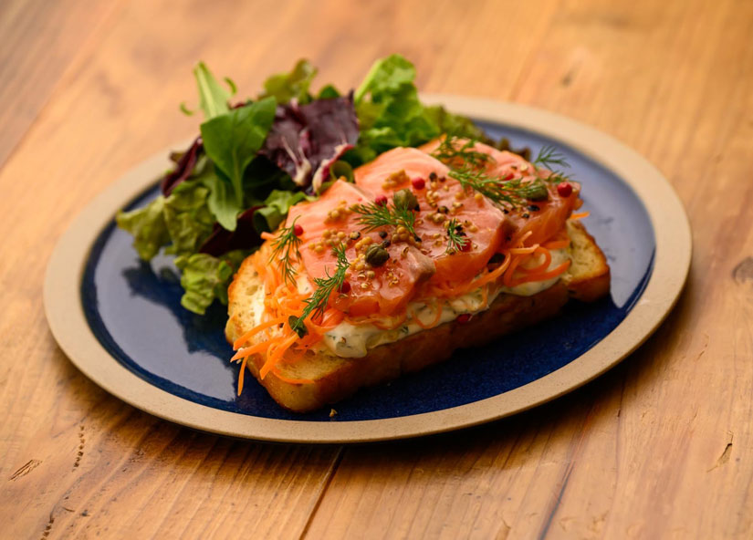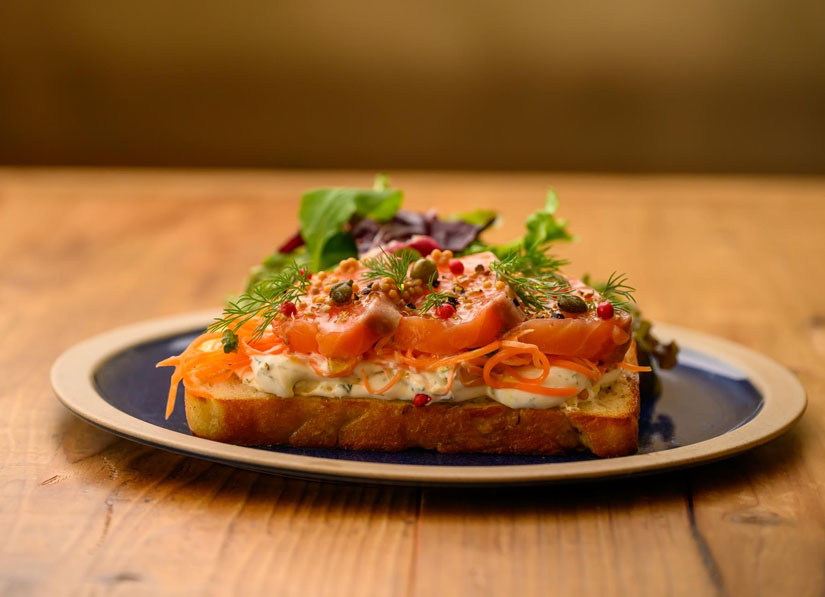 オープンサンド発祥の地である北欧の定番を再現したメニュー。マリネした肉厚のサーモンに、サワークリームのほんのり酸っぱい味が程よく合い、さわやかな味わい。ケッパーの酢漬けとディルという香草が、北欧らしい本格的な風味を加えています。サーモンの臭みを取り除いてからマリネに加工することにこだわり、ぷりぷりとした弾力あるおいしさになるように工夫されています。