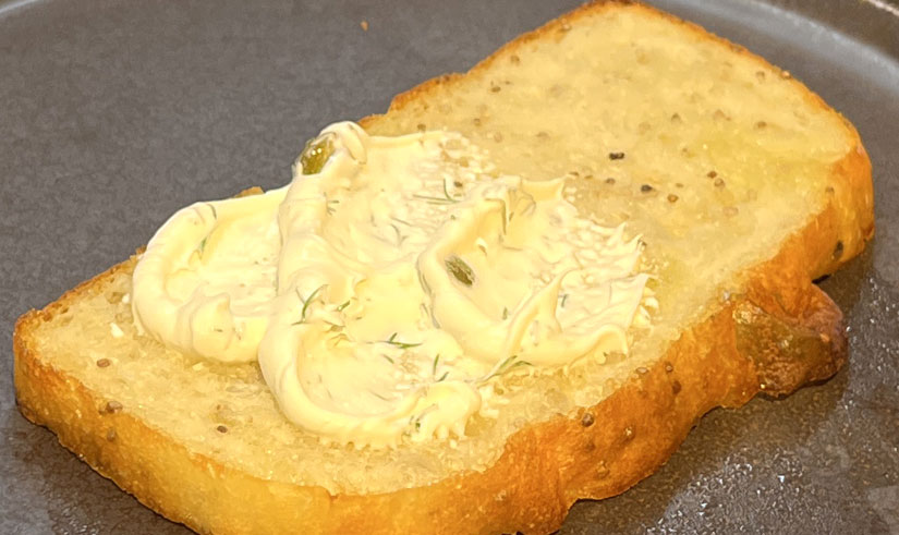 リコッタチーズとバナナを使った甘いオープンサンドです。焦がした砂糖をキャラメリゼし、はちみつとキャラメルソースがかかった贅沢な仕上がり。