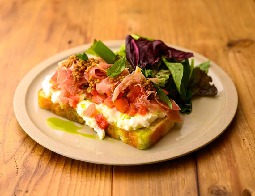 カプレーゼを表現したオープンサンド。生モッツァレラ、トマト、生ハム、バジル、そしてプチプチの粒マスタードが組み合わされています。生ハムの塩味と生モッツァレラのクリーミーさに、粒マスタードの辛味と食感がアクセントに。