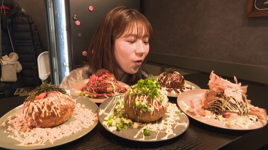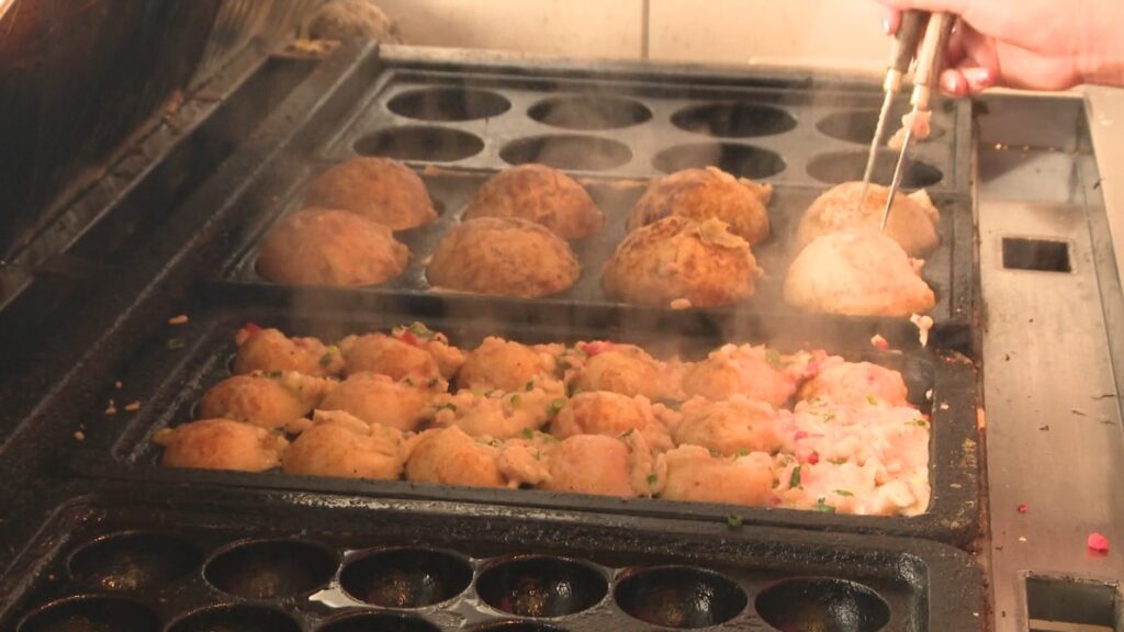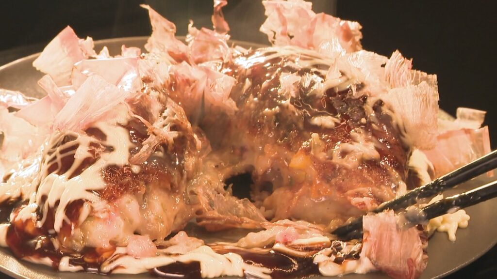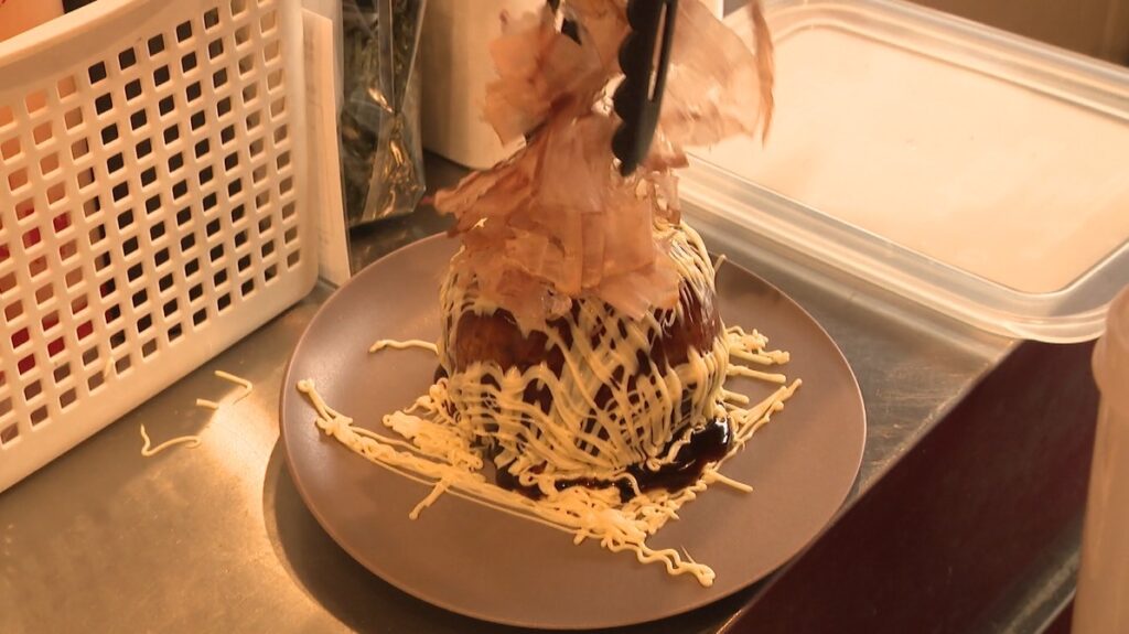 見た目は巨大なたこ焼き、食感や味はお好み焼き・もんじゃ焼きのハイブリッド。三浦さんは「粉ものの王者です!」と言い切ります。ソースとマヨネーズをかけた定番に加え、明太子やネギ塩など様々な味のバリエーションも楽しめます。