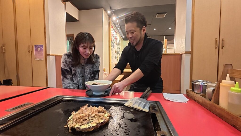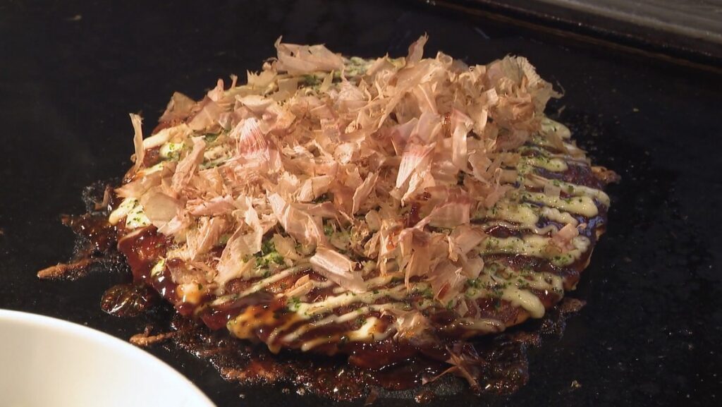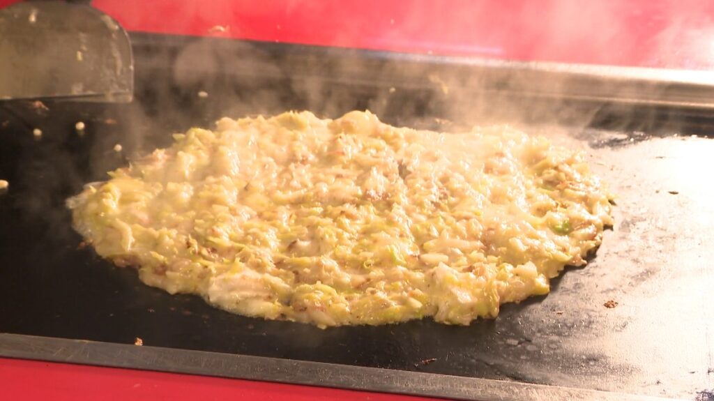 鉄板の上でジュージューと焼き上がるお好み焼き。「うちは、これだけじゃないんですよ」と声をかけるのは店主の日原誠さん。