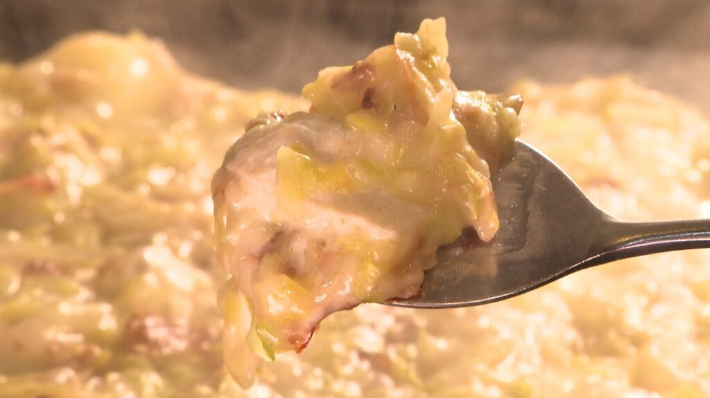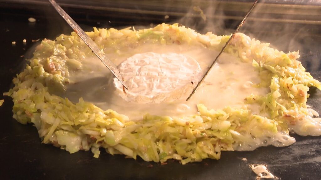 東京の下町生まれの粉もの・もんじゃ焼き。キャベツなどの具材で土手を作って、出汁で溶いた小麦粉を流し入れて焼いていきます。鉄板焼き担当の誠さんのイチオシは、まるまる1個のカマンベールチーズを使うもんじゃです。