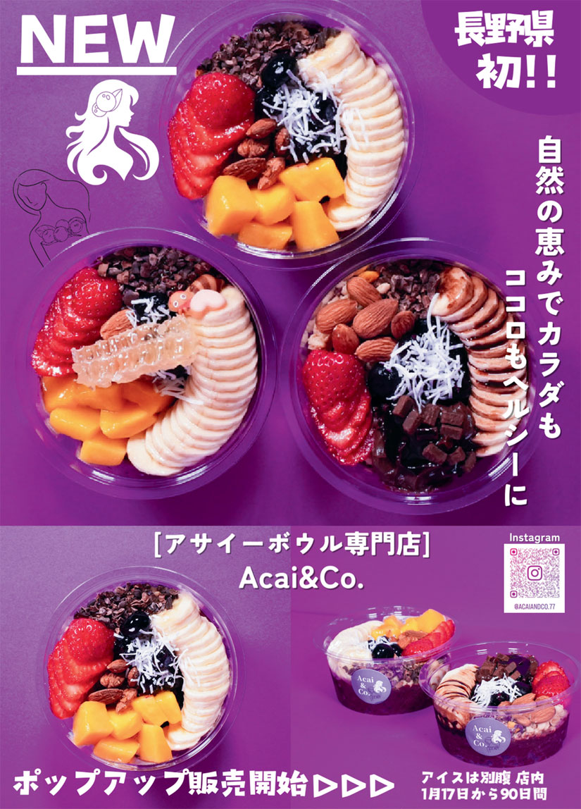 長野県松本市に、アサイーボウル専門店「Acai & Co.(アサイーアンドコー)」のポップアップショップが2026年1月17日(土)から4月16日(木)までの90日間限定でオープン。長野県内では初出店です。お店は、松本駅から徒歩5分の「アイスは別腹 松本店」。
