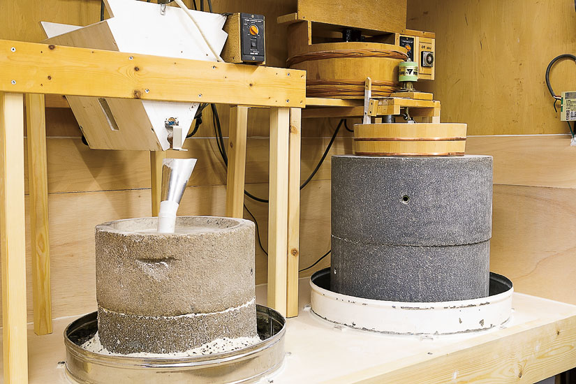 そばの酸化を防ぎ、香りを引き出したいと、安山岩を削り出して自作したという電動石臼。