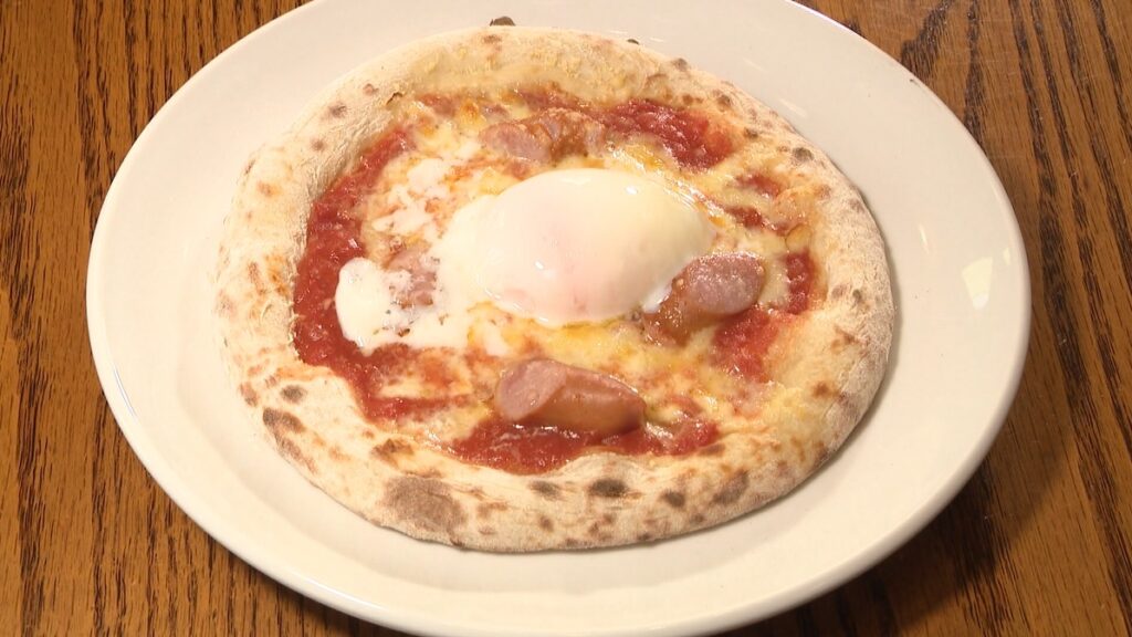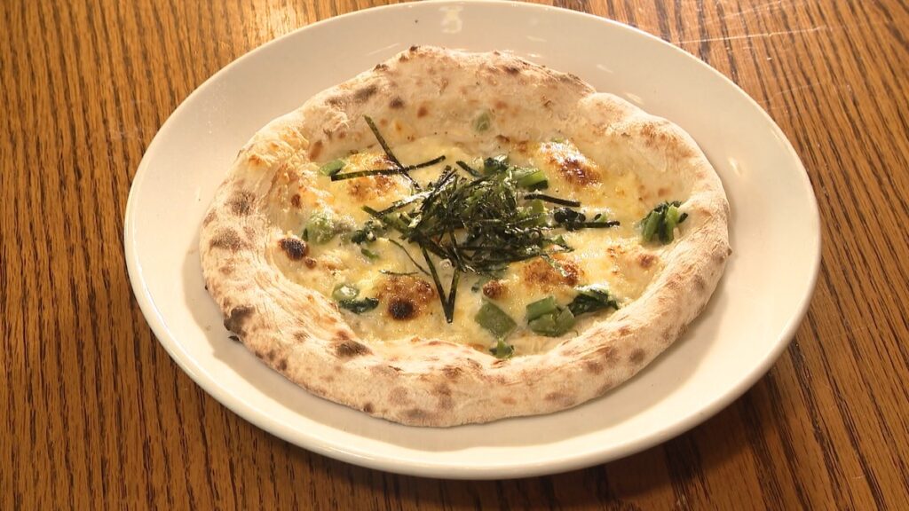 まずはピザから。注文が入ってから生地を一つひとつのばし、釜で焼き上げるスタイル。出来立てアツアツ、もっちもちの生地が魅力です。