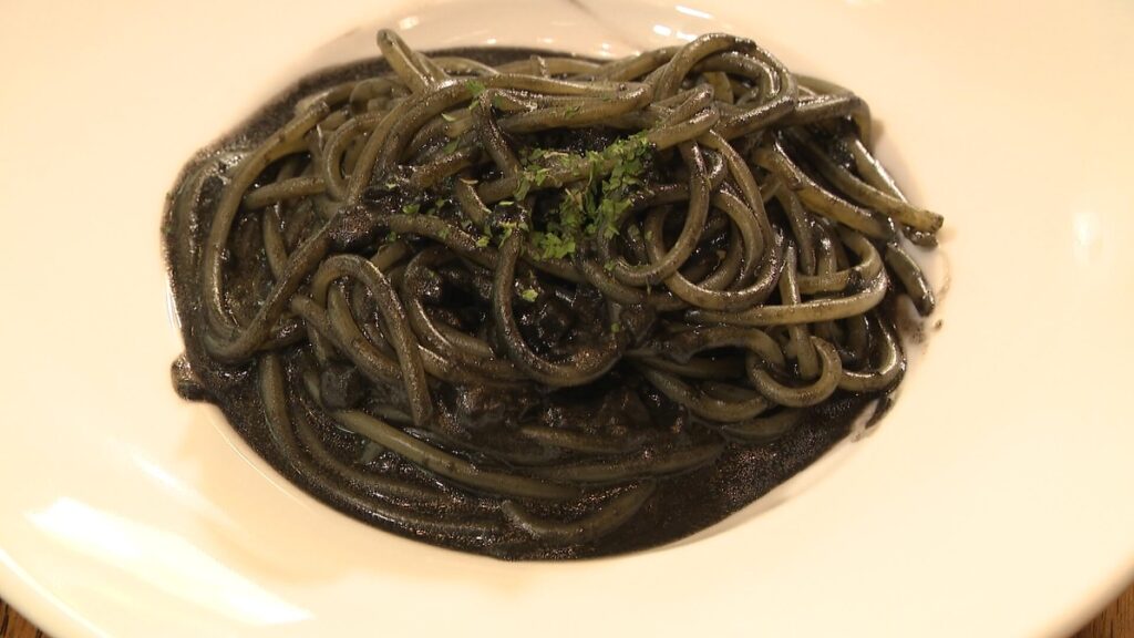 1位はおなじみ「イカスミ」のパスタです。うま味が強く、全体としては優しい味わい。わずかに感じる苦みもアクセント。食べ放題なので、気軽に注文できますね。