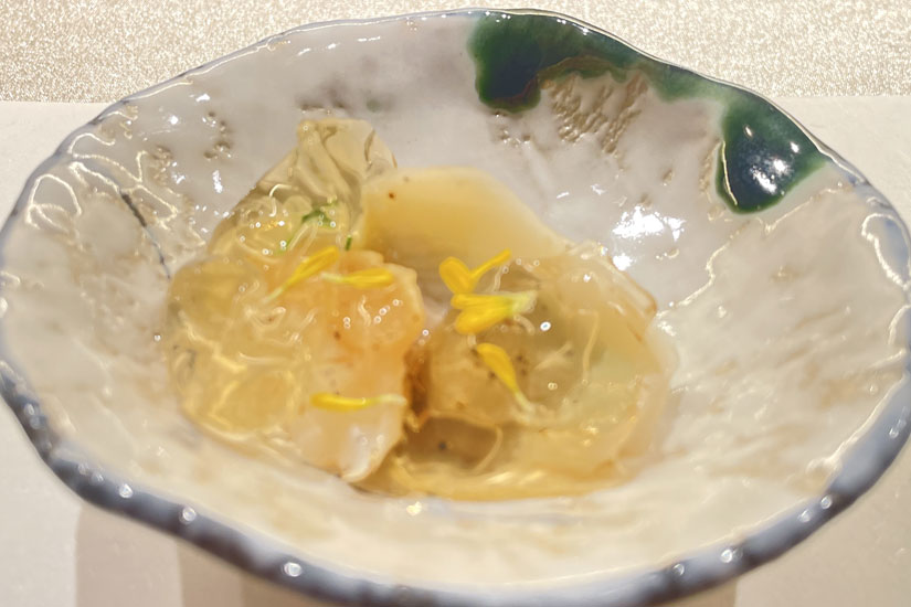 前菜は「つぶ貝の出汁ジュレ掛け」。