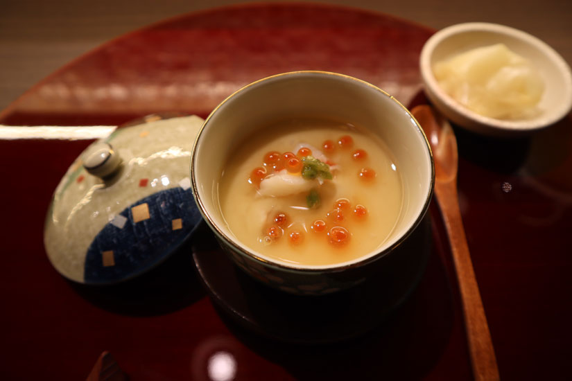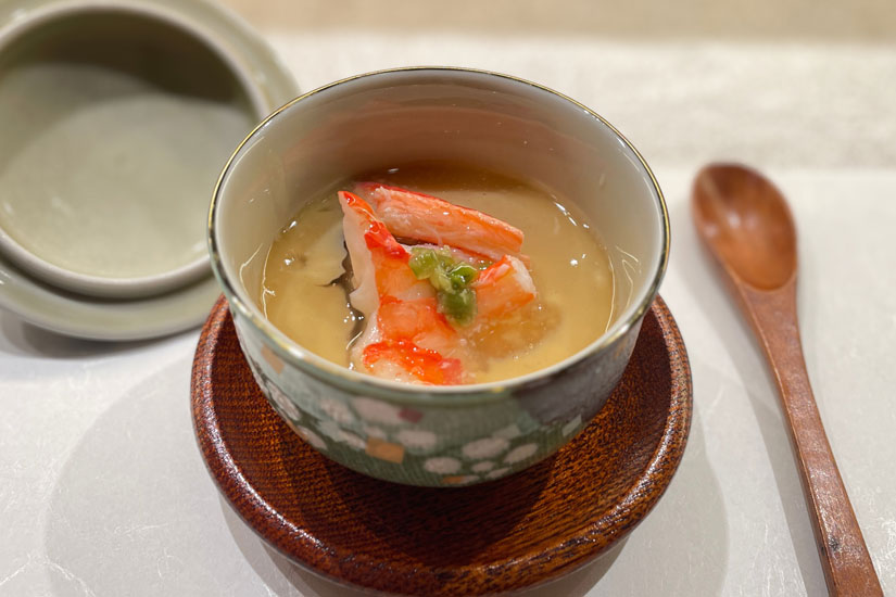 紅ズワイガニや舞茸などが入った「茶碗蒸し」。刻まれた山葵の茎がアクセント。