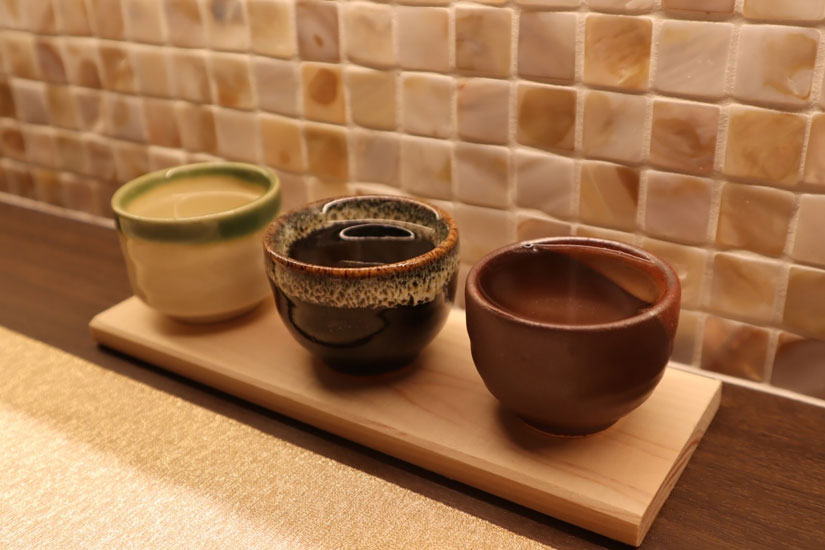 日本酒に親しみのない方にも楽しんでいただけるよう、由依さんがセレクトした三種の日本酒を少量ずつ味わえる「テイスティングセット」を用意。また料理に合わせたペアリングの提案も行っています。