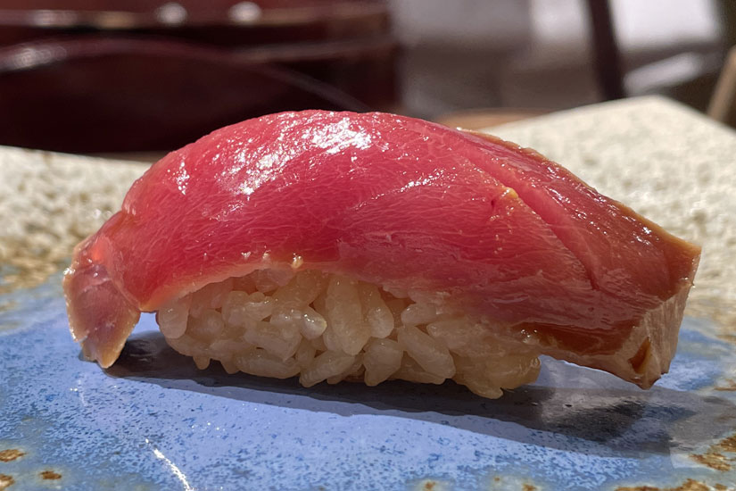 特製の醤油ダレに半日漬け込んだ「漬けマグロ」は、醤油のコクとねっとりとしたまぐろの食感が重なる一貫。