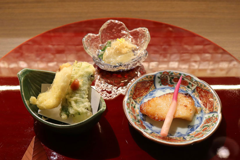 ランチコースの「前菜3種盛り合わせ」は、季節の食材の天ぷら・焼き物・小鉢。