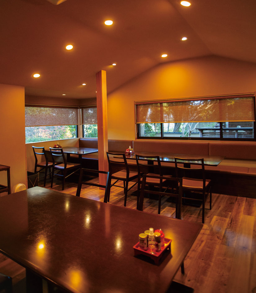 店へと続く小路はもちろん、店内の大窓からも眺められる自慢の庭園は、新緑から紅葉、雪景色といった四季の移ろいに加え、サツキ・ドウダンツツジ・ヒメシャラ・ツバキ・サザンカなど、愛らしい花々も見どころ。