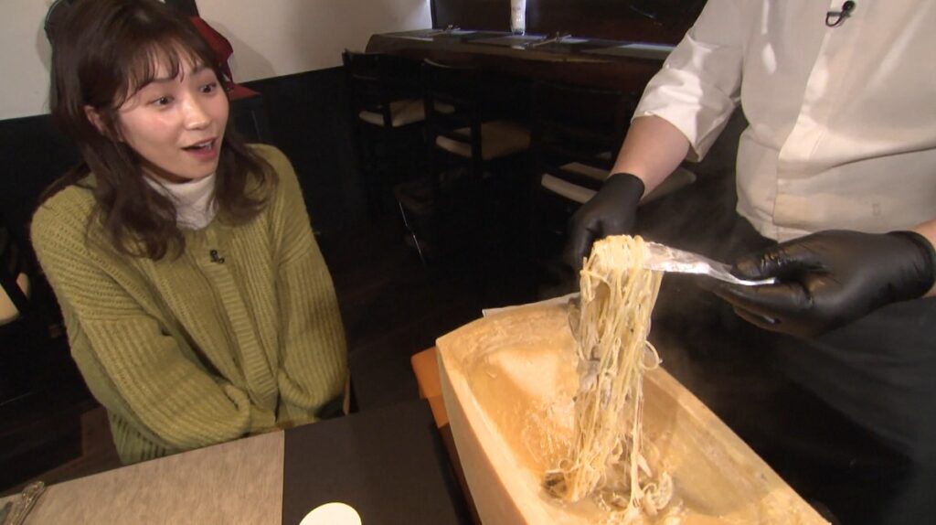 チーズのパフォーマンスはさらに続きます。巨大なチーズを器にして、あぶって香ばしさを出したチーズとアツアツのパスタを絡めていきます。仕上げにブラックペッパーをかければ「カチョ・エ・ペペ」の完成です。