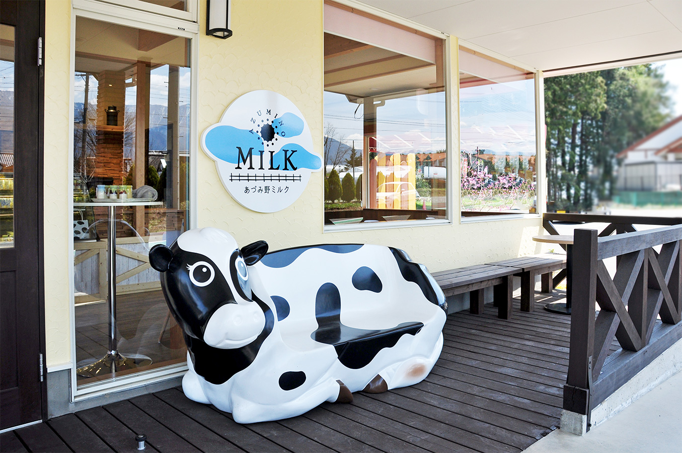 店舗入口には「モーモーベンチ」も設置されており、安曇野のさわやかな風を感じながら記念撮影を楽しむことができます。