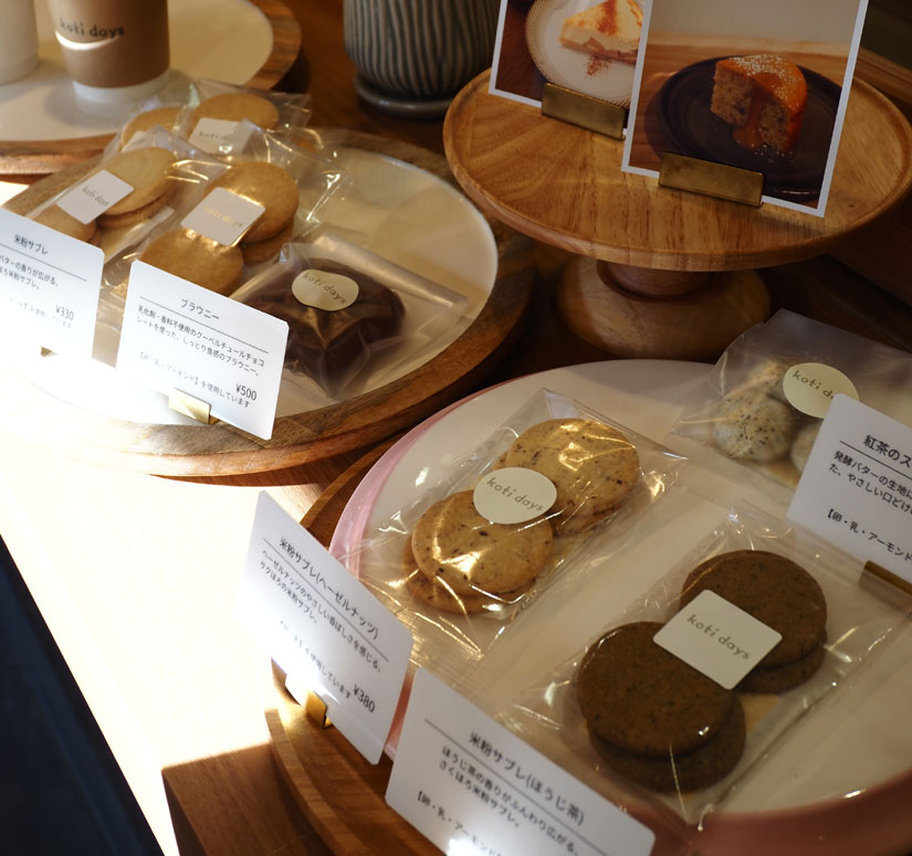 米粉を使ったサブレ、ブラウニー、クッキー系、ヘーゼルナッツなど、店主がグルテンフリーにこだわった焼き菓子が並びます。焼き菓子のみの購入、またその場で購入し店内で飲食も可能です。