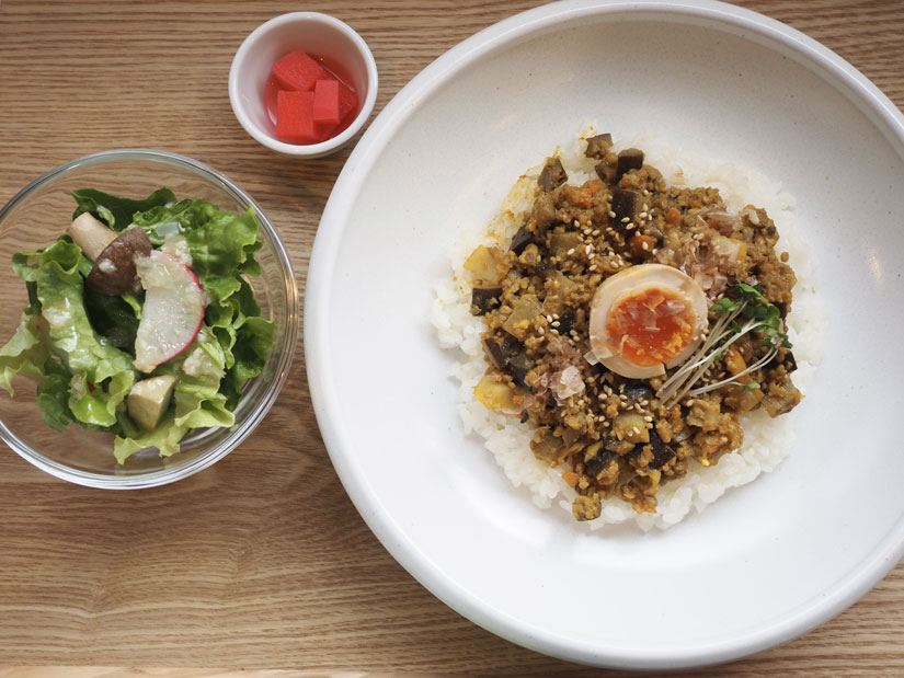 カレーセットも不定期にメニューが変わります。自家製麹ドレッシングのサラダ、リンゴ酢のピクルスがセットに。現在は、自家製麹の味噌を使った和風キーマカレーが味わえます。味噌を加えることで辛さを控えめにし、やさしい和風テイストに。塩麹ごはんと併せて味わうことで、麹ならではの旨みとコクを楽しめるそう。